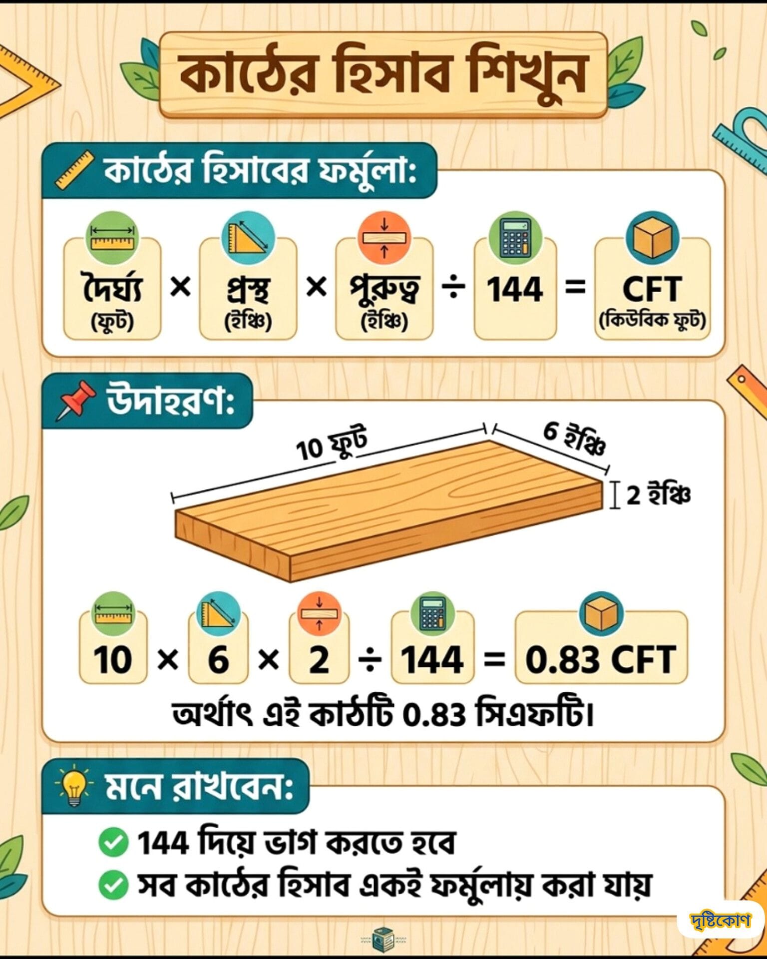 • যেকোনো ধরনের চৌকাঠ, তক্তা বা বর্গা—সব ধরণের কাঠের ক্ষেত্রে এই একই সূত্র কার্যকর।
