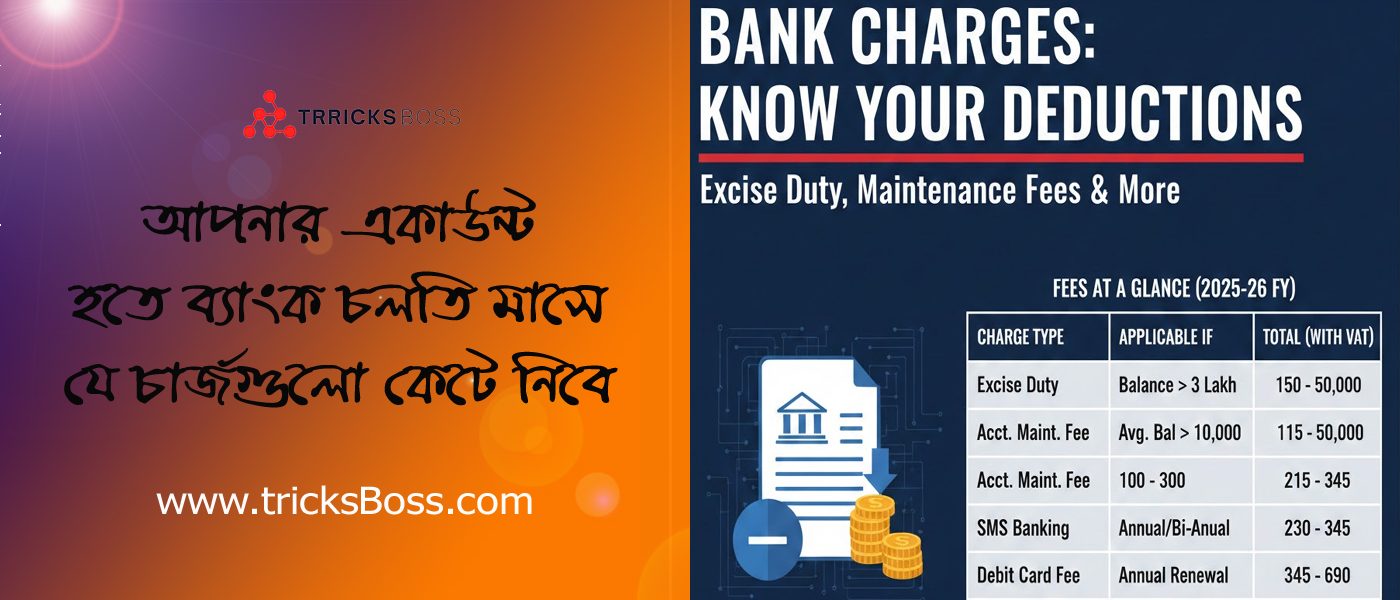 আবগারি শুল্ক (Excise Duty): আপনার অ্যাকাউন্টে সারা বছরের মধ্যে (জানুয়ারি ১ থেকে ডিসেম্বর ৩১) ব্যালেন্স যদি একবারের জন্যও ৩ লক্ষ টাকা অতিক্রম করে, তবেই সর্বনিম্ন ১৫০ টাকা কাটা হবে। ৩ লক্ষ টাকার নিচে থাকলে এটি ০ টাকা।