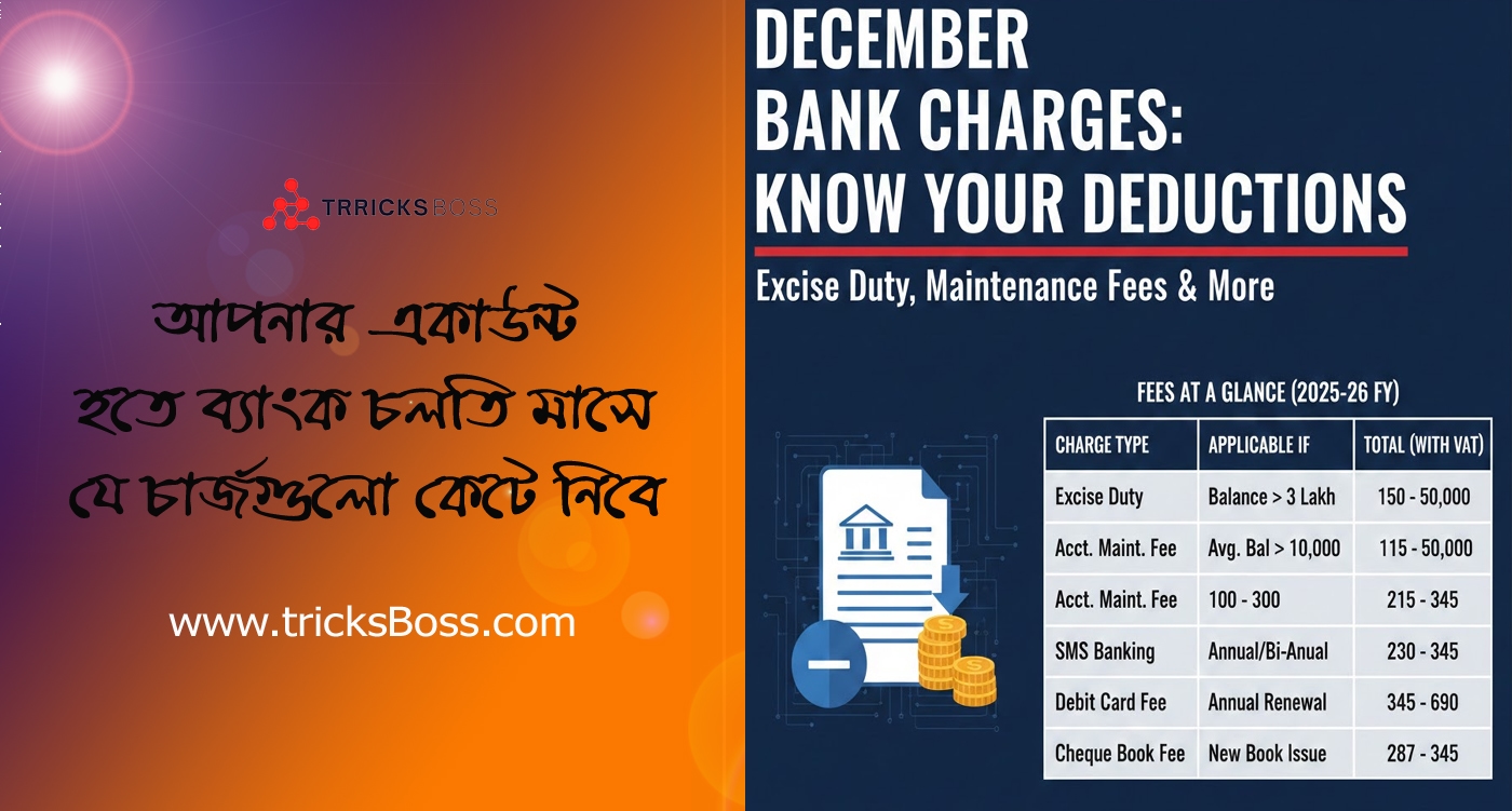 বছরের শেষ মাস ডিসেম্বরে ব্যাংক গ্রাহকদের অ্যাকাউন্ট থেকে নিয়মিতভাবেই কিছু নির্দিষ্ট চার্জ এবং সরকারি কর কাটা হয়। অনেক গ্রাহক হঠাৎ অ্যাকাউন্ট থেকে টাকা কমে যাওয়ায় বা মোবাইলে মেসেজ পেয়ে বিভ্রান্ত হন। তবে ব্যাংকিং নিয়ম অনুযায়ী, প্রতি বছর ডিসেম্বর মাসে আবগারি শুল্ক ও অর্ধবার্ষিক রক্ষণাবেক্ষণ ফি কাটা বাধ্যতামূলক।