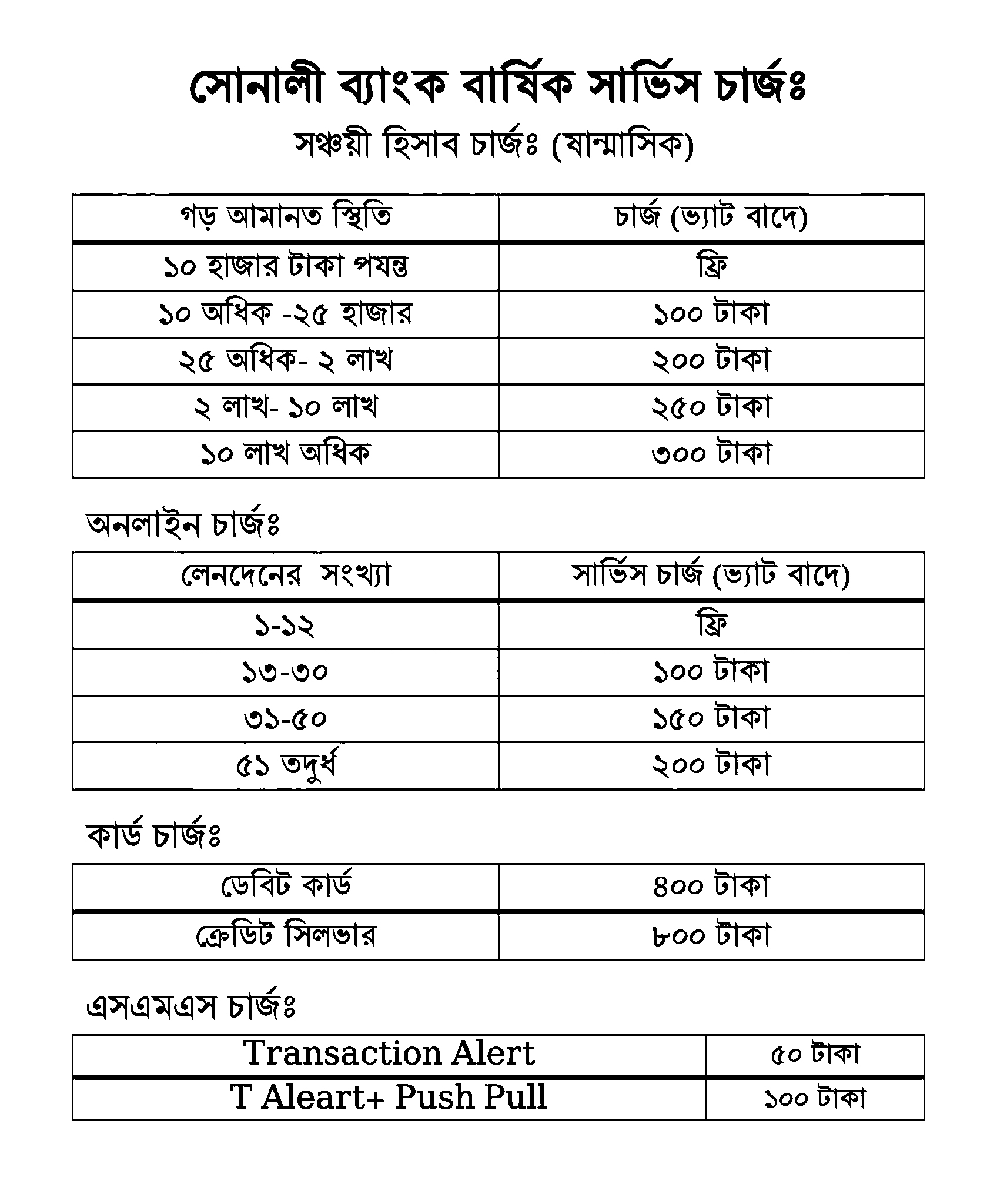 এসএমএস চার্জ: লেনদেন বা ট্রানজ্যাকশন অ্যালার্টের জন্য ৫০ টাকা এবং পুশ-পুল সেবাসহ অ্যালার্টের জন্য ১০০ টাকা চার্জ নির্ধারণ করা হয়েছে।