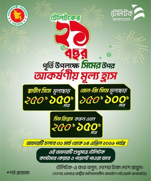 সাফল্যের ২১ বছর পূর্ণ করল দেশের একমাত্র রাষ্ট্রায়ত্ত মোবাইল নেটওয়ার্ক অপারেটর টেলিটক বাংলাদেশ লিমিটেড। এই গৌরবোজ্জ্বল পথচলা উদযাপন উপলক্ষে গ্রাহকদের জন্য সিম ক্রয় এবং সিম রিপ্লেসমেন্টের ওপর বিশেষ মূল্য ছাড়ের ঘোষণা দিয়েছে প্রতিষ্ঠানটি। আজ থেকেই দেশজুড়ে টেলিটকের নির্দিষ্ট সেবা কেন্দ্রগুলোতে এই অফারটি কার্যকর হয়েছে।